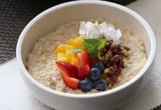 Киноа на кокосовом молоке со свежими ягодами, персиками и орехами