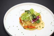 Оладушка из цукини с яйцом пашот и лососем слабой соли