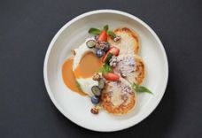 Сырники с соленой карамелью, кремом из маскарпоне и свежими ягодами
